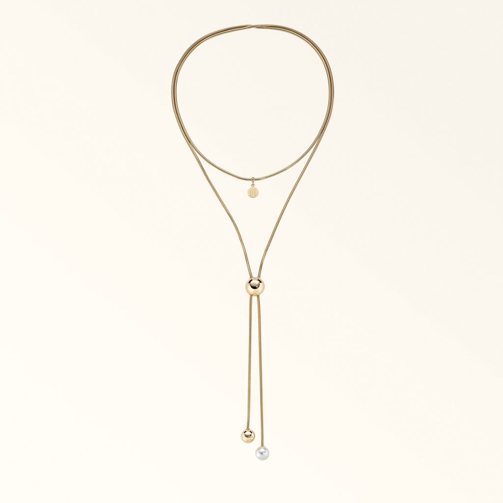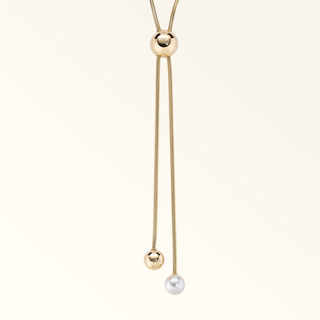 A modern Y-shaped necklace with a long mouse-tail chain, elegantly finished in yellow gold plating. The design is adjustable through a central sphere, allowing effortless customization of the length for versatile styling.
