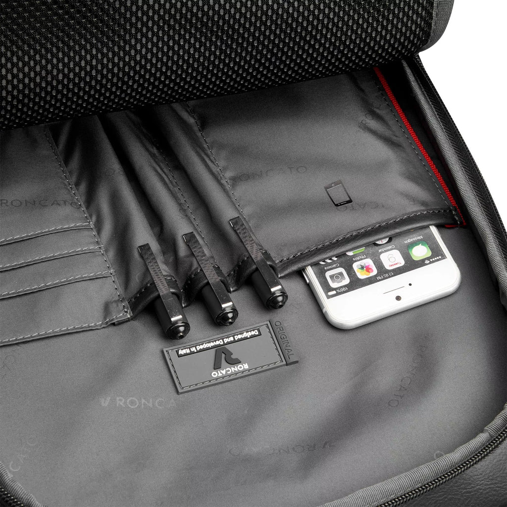 Work backpack organized with 2 compartments, equipped with pockets and internal compartments of various sizesCompartment for 15.6" PC and 11" tabletThis product features a USB port for charging your electronic devices. The battery is not included.Adjustable padded shoulder straps and a rear strap to secure the backpack to the trolley tubesPadded rear compartment to protect the computer and tabletExcellent resistance and long-lasting durabilityInternal organization with pockets for smartphones, power banks, and documentsProduct made of ballistic nylon, an extremely resistant and versatile fabricPVC inserts that replicate the vintage effect of grained leather, giving the line a masculine and trendy lookProduct designed in Italy at the Design and Development department of Valigeria Roncato
