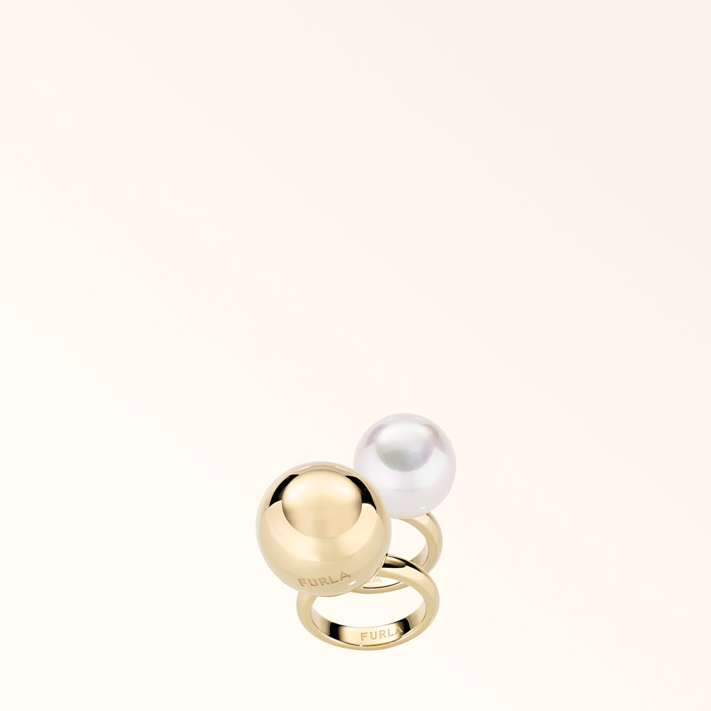 A refined ring set consisting of two silver-tone plated rings: one with a large polished steel sphere and the other with a luminous imitation pearl. Designed for versatile wear.