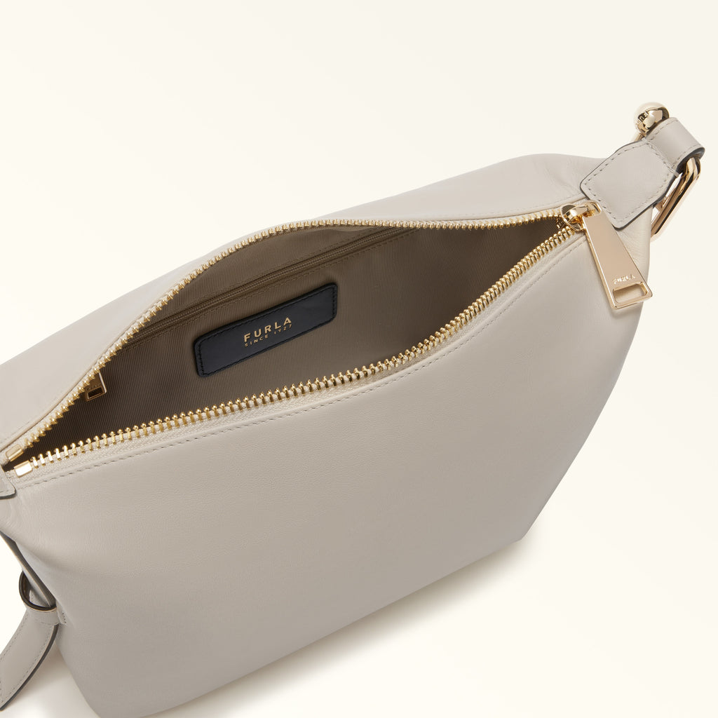 This Furla Tonie is a medium size hobo bag made from Claris Lux calfskin leather. This model has a very soft and easy style, with a big internal capacity and an adjustable strap that allows you to wear it both as a shoulder bag and a crossbody. The strap can also be removed and you can clasp together the double Furla Arch hardware to form a distinctive handle.