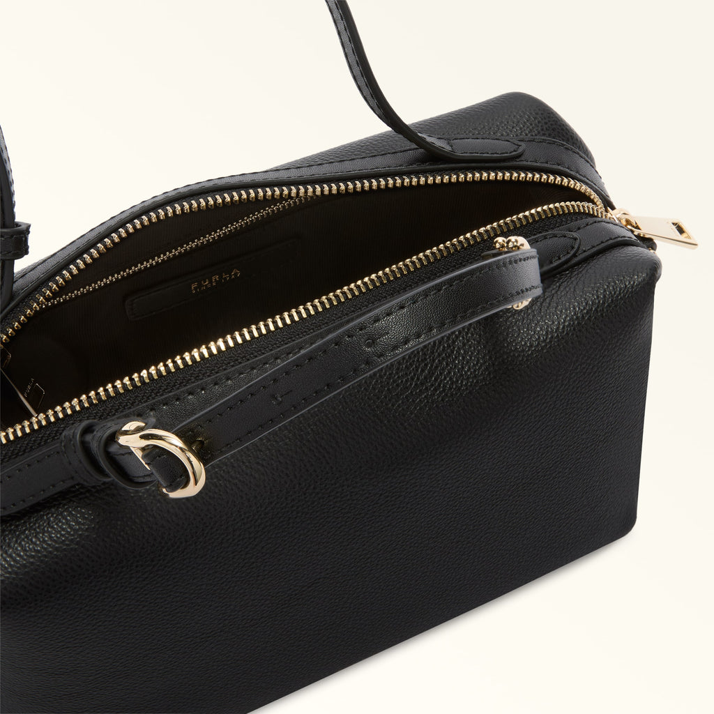 Mini sized Boston Bag from Furla Double line. This style comes with a detachable shoulder strap, it is made of grained Night calf leather and has a soft and versatile design; the bag features a double strap handle enriched by the double arch logo and two D rings that allow you to play with charms and key rings.