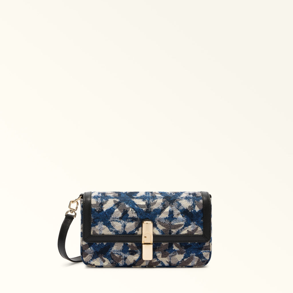 Medium crossbody bag. Its compact body is crafted from velvet with delicate canvas stripes. The magnetic closure is accented by a cylindrical metal clasp engraved with the iconic Furla Arco logo. The adjustable, removable strap allows for multiple styling options. The style features a very versatile and modern shape and it is closed though a magnetic snap decorated with the cylindrical metallic hardware enriched by the Furla Arch logo. This bag can be worn either on the shoulder or cross-body thanks to the detachable and adjustable shoulder strap.