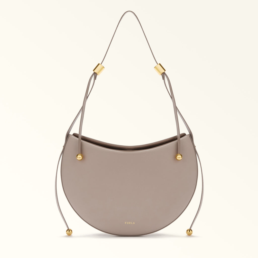 Saddle shaped, medium sized shoulder bag from Furla Moonstone line. The style is made of smooth Sidney leather and it come with an adjustable shoulder strap that allows you to wear it at different length.