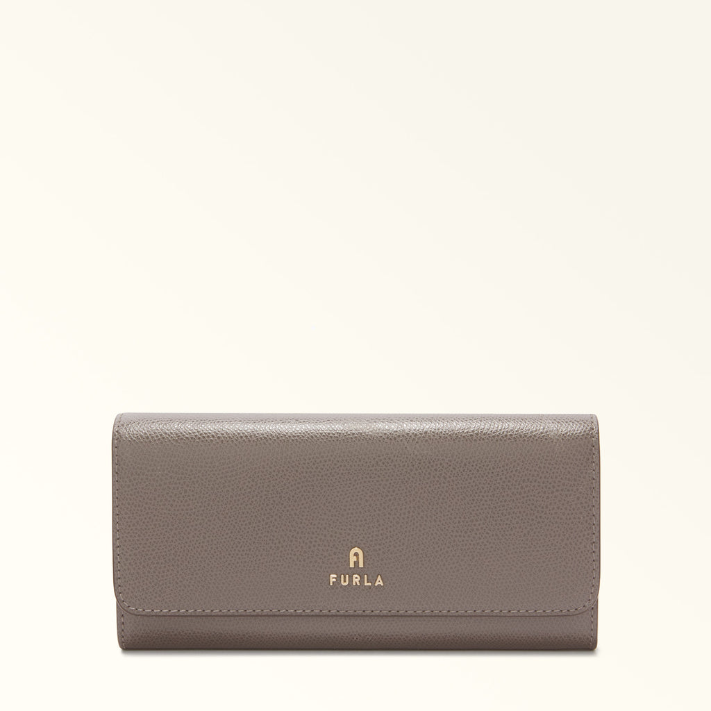 Continental wallet in Ares textured leather. One open pocket on the back for easy access to essentials. Furla + Arch mini lettering logo with light gold finishing. 12 slots for credit cards. 3 large compartments for banknotes. Internal zipped pocket for coins.